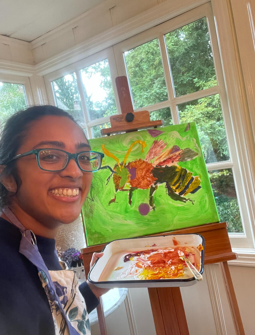 Daksha is a multidisciplinary artist whose work explores love, perception, and the interplay between inner and outer worlds. Working across painting and mixed media, her practice includes abstract portraiture, a self-portrait series, and contemplative works inspired by place, memory, and felt experience.She paints abstract portraits of people she loves, alongside a sustained self-portrait practice born from a turning inward—an exploration of self-love after years of directing energy outward. These works are less about likeness than presence, holding the emotional and energetic traces of relationship, care, and attention. Painting becomes a practice of falling in love again and again, with self, with others, and with life itself.Daksha also paints places she loves and creates works that arise directly from emotional states, allowing color and gesture to carry feeling without narrative constraint. Having grown up in Singapore and lived in Scotland and the United States, her work is shaped by multiple cultural landscapes and ways of seeing, and by a sensitivity to transition, belonging, and return.Color is core to her work. Drawing inspiration from Aura-Soma, crystals, and gemstone traditions, she works with vibrant palettes intuitively yet with restraint, treating colour as both emotional language and energetic structure. Her background in physics and anthropology informs an underlying attentiveness to light, pattern, and human connection, while meditative practice grounds her creative process in stillness and presence.